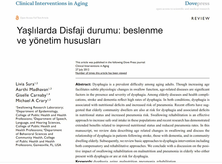 Her iki durumda da disfaji, beslenme eksiklikleri ve artan pnömoni riski ile ilişkilidir. Son zamanlardaki çalışmalar, yaşlıların disfaji ve buna bağlı olarak beslenme durumundaki eksiklikler ile artan pnömoni riski altında olduklarını göstermiştir.
