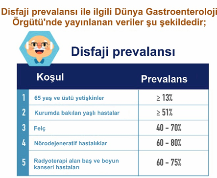 ● Disfaji yaygınlığı, bakım ortamının, hastalık durumunun ve araştırılan ülkenin bir fonksiyonu olarak rapor edilmiş olup, gerçek prevalansı belirlemeyi zorlaştırmaktadır.