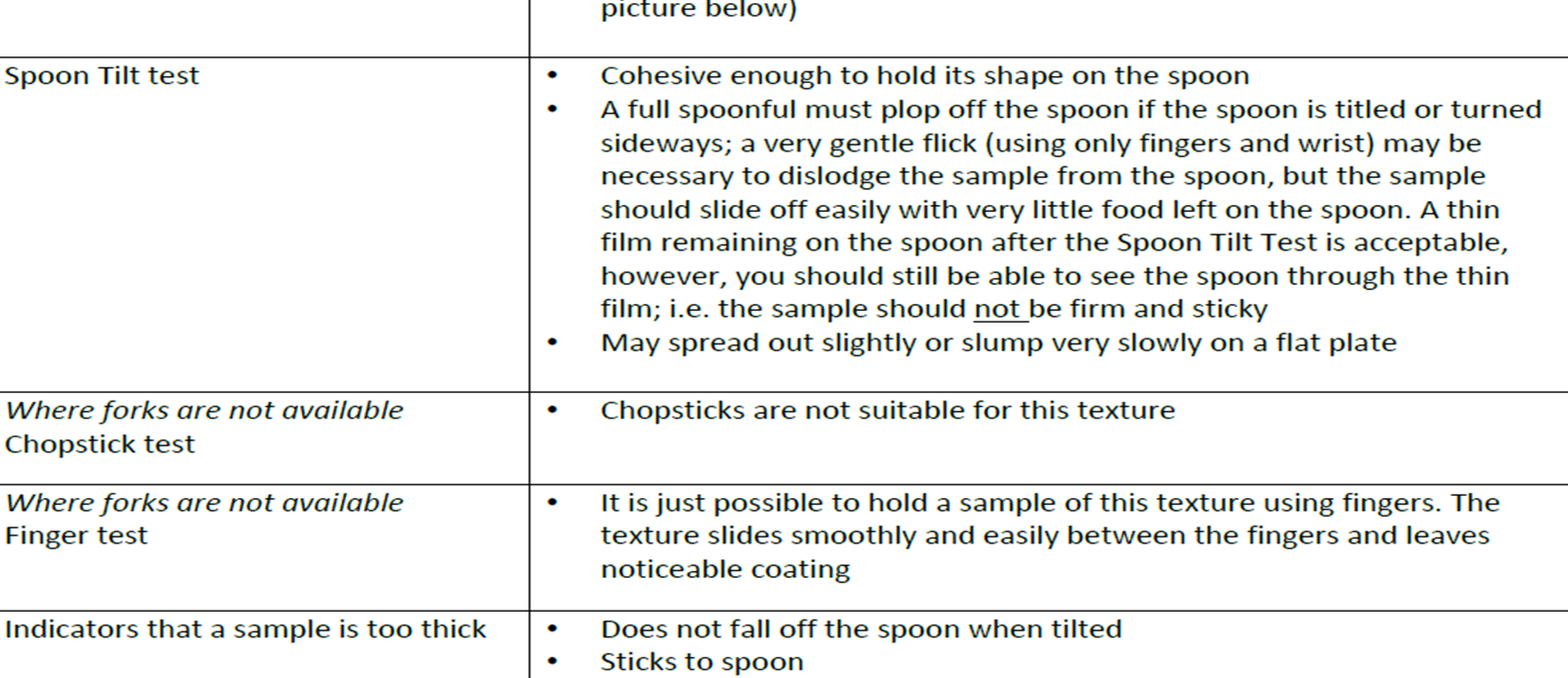 • A full spoonful must slide/pour off/fall off the spoon if the spoon is tilted or turned sideways or shaken lightly; the sample should slide off easily with very little food left on the spoon; i.e. the sample should not be sticky