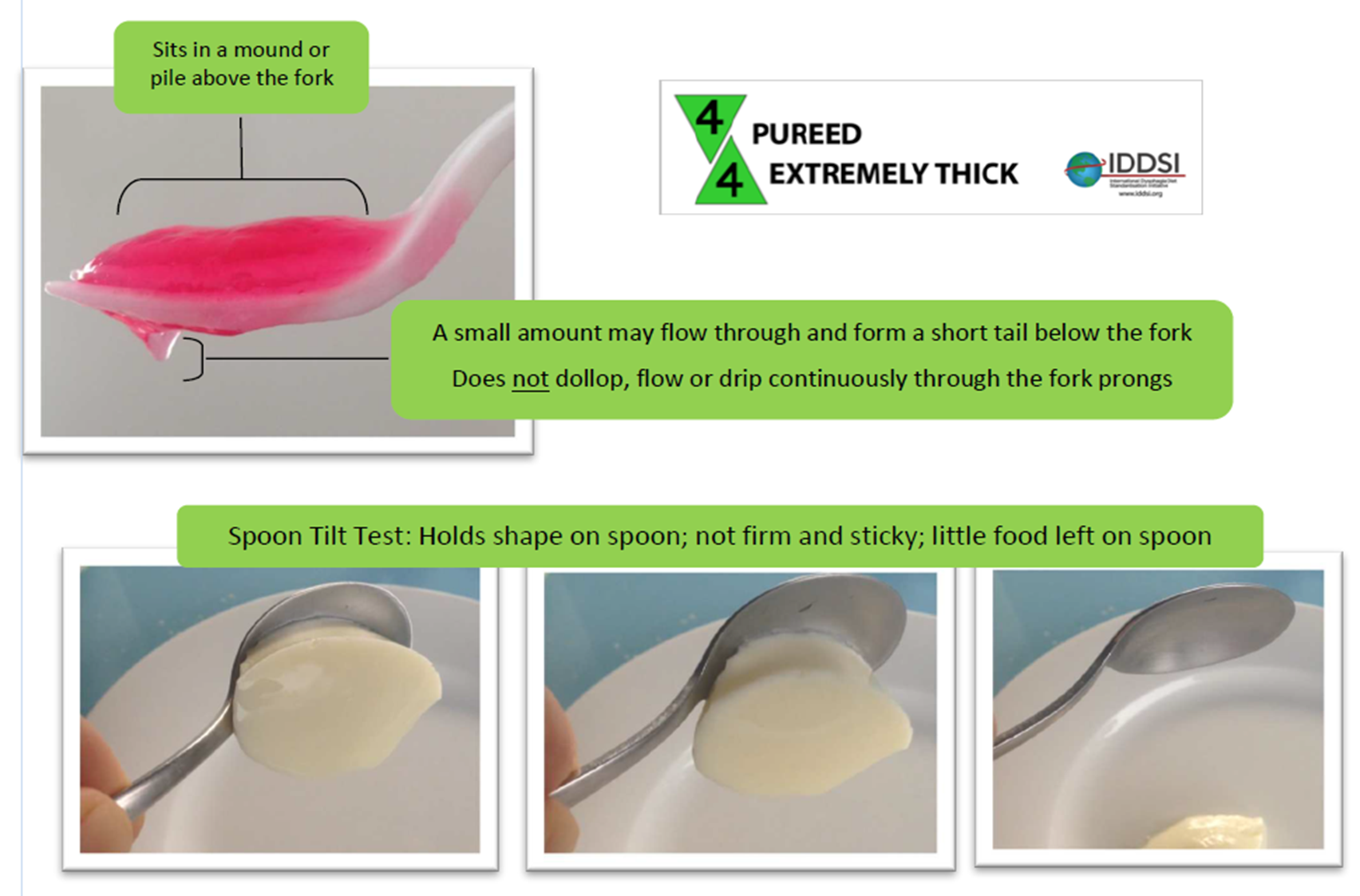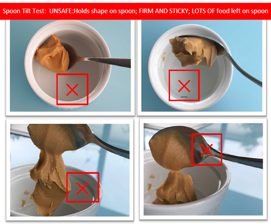 The following images show examples of foods that would be suitable or unsuitable for Level 4 according to the IDDSI Spoon Tilt Test