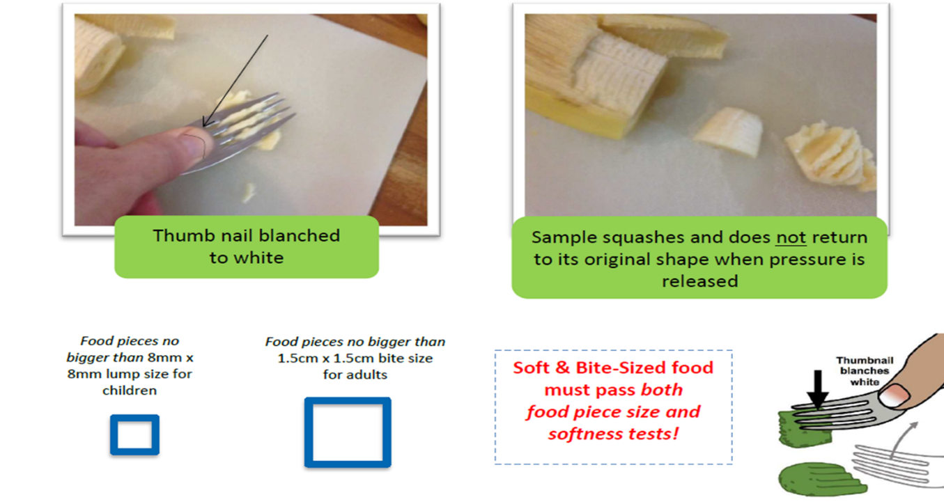 • If texture cannot be served soft and tender at 1.5 cm x 1.5 cm (as confirmed with fork/ spoon pressure test), serve minced and moist