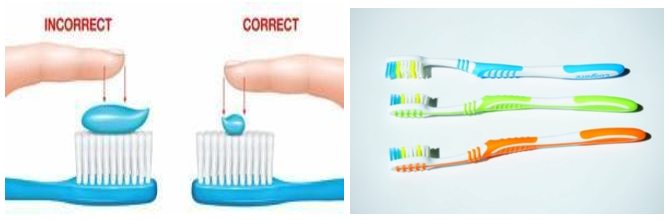 nedidelį žirnio dydžio kiekį dantų pastos ant sauso dantų šepetėlio.