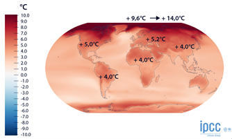 En primer lugar, notemos que este calentamiento global no es, por supuesto, homogéneo en todas las regiones del planeta. Este mapa muestra el calentamiento proyectado para 2100 con el escenario de mayor calentamiento. Podemos leer que el Ártico será la región del mundo que más se calentará para 2100 con un promedio de +9.6°C, pero que incluso podría alcanzar +14°C en algunos lugares en comparación con el promedio del período 1850-1900. ¡Es con-si-dable! Aún con este mismo escenario, Europa experimentará un calentamiento de +5,2 °C, Estados Unidos +5 °C, o +4 °C para África ecuatorial, India y Brasil.
