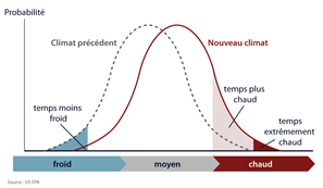En cuanto a la temperatura, podemos considerar que hay dos extremos, un extremo caliente y un extremo frío como podemos ver en esta curva esquemática de la distribución de temperatura. Dado que el efecto invernadero actúa las 24 horas del día, durante todo el año, el calentamiento global afecta también a toda la distribución de la temperatura. Por lo tanto, el calentamiento global hará que esta curva estadística de distribución de temperatura se desplace hacia la derecha, hacia temperaturas más cálidas. Este cambio conduce a un aumento en la temperatura promedio, pero también a un aumento en los extremos: los extremos fríos se volverán más suaves (y luego menos frecuentes para un evento ya observado), y los extremos cálidos se volverán más cálidos (y luego más frecuentes).