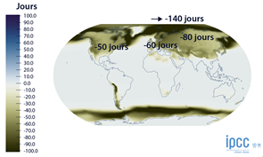 El número de días de heladas, es decir, el número de días con una temperatura mínima inferior a 0 ° C, disminuirá en 2100 con el escenario más alto: - 60 días para Europa, - 50 para los Estados Unidos, - 80 para el norte de Rusia, y hasta - 140 días para el Ártico.