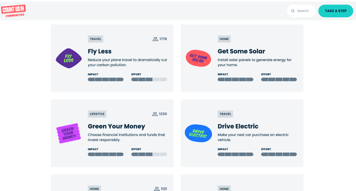Activitat: Uneix-te-hi (Count us in). Vés al lloc web de la campanya Take a Step i tria un dels passos suggerits. Respon les preguntes proposades i, al final del qüestionari, assumeix el compromís de fer un gest pel clima. El teu compromís s'enregistrà juntament amb el de milers de ciutadans europeus.