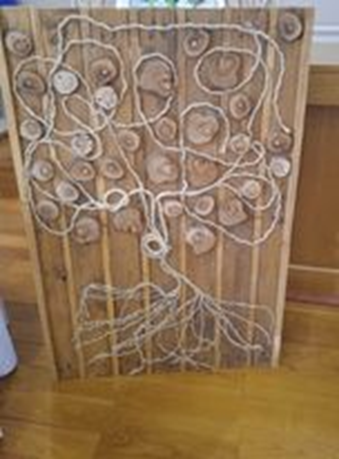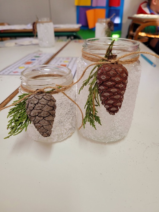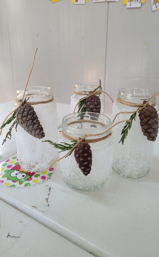 Antes de Navidad, nuestros estudiantes trajeron frascos usados para hacer manualidades. Los cubrimos con una fina capa de pegamento y rociamos una capa de sal fina encima. Los dejamos secar y luego se decoraron con piñas y pequeñas ramas de pino.
