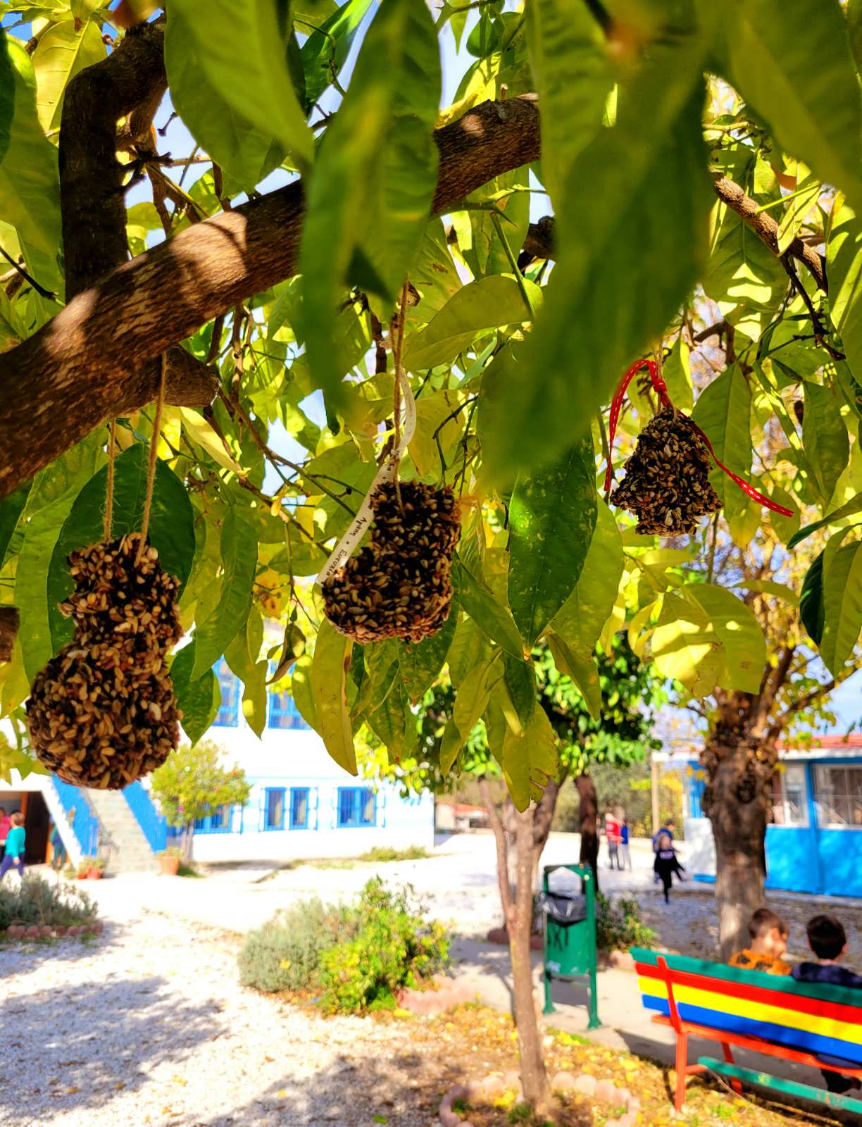 A través de actividades experienciales, los estudiantes de primer grado notaron que cuando la temperatura cambia y el clima se vuelve más frío, las aves no encuentran comida fácilmente. También aprendieron que cada año muchas especies de aves logran una hazaña de viaje, dos veces. Una vez de sur a norte en primavera y otra en otoño siguiendo el curso inverso. La ruta que tienen que tomar no es fácil y las distancias que recorren son largas. Durante un viaje tan agotador, se requiere una gran cantidad de energía. Así que pensaron, es una buena oportunidad para ayudar a sus amigos emplumados y también observar la naturaleza. ¡Colgamos los adornos de los árboles en el patio de nuestra escuela y observamos que los pájaros los devoran! Este alimentador es fácil de hacer, económico y no deja basura.