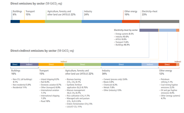 Au niveau mondial en 2019, le secteur économique le plus émetteur est le secteur industriel avec 24% suivi de près par le secteur de la production d'électricité et de chaleur avec 23% des émissions mondiales d'équivalent CO2. Vient ensuite le secteur comprenant l'agriculture, la sylviculture et les activités anthropiques d'utilisation des terres, y compris les incendies de forêt, la déforestation, les feux de tourbe, etc. qui est le troisième plus grand émetteur de gaz à effet de serre avec 22 %. Il est suivi par les émissions du secteur des transports (15 %) et des bâtiments (avec un peu moins de 6 %). Enfin, diverses activités liées au secteur de l'énergie pour 10 %. Bien entendu, tous ces chiffres sont à considérer avec leur marge d'erreur.