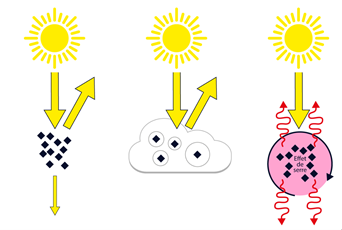 Les aérosols jouent un double jeu encore mal évalué. D'une part, ils vont participer à un refroidissement climatique puisque, d'une part, ils vont jouer un rôle de pare-soleil en réfléchissant une partie du rayonnement solaire et, d'autre part, un rôle de noyau de condensation favorisant