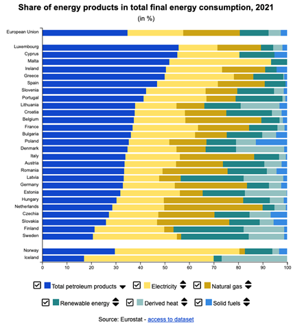 Aquest article https://ec.europa.eu/eurostat/web/interactive-publications/energy-2023 mostra un desglossament de la manera com els diferents països d'Europa consumeixen energia. D'aquest diagrama podem veure que Europa està en un camí per reduir les emissions de combustibles d'efecte hivernacle i augmentar les renovables, però està trigant temps.